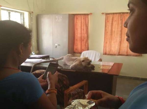 बंदर को टेबल पर सोता देखतीं महिला प्यून