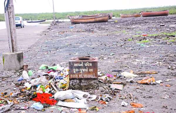 कलश के आस-पास पूजा सामग्री और कचरा फैला नजर आया।