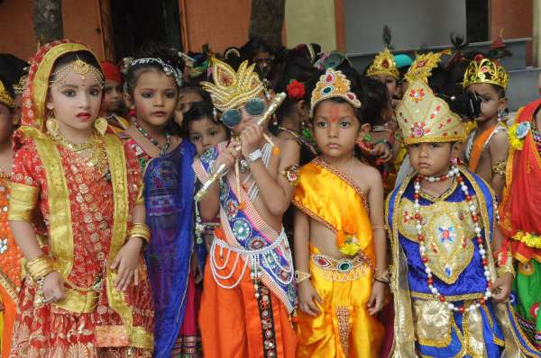 बच्चे कृष्ण और राधा की वेशभूषा में स्कूल आए।