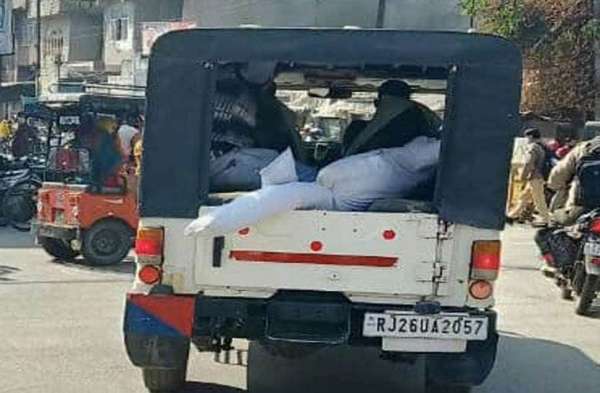 पुलिस की गाड़ी में पुतला रखते पुलिसकर्मी।