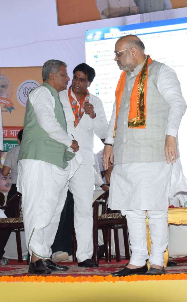 भाजपा के राष्टीय अध्यक्ष अमित शाह क्रषि मंडी में शक्ति केंद्र के प्रभारियों कार्यक्रम के दौरान राज्य सभा सांसद आेम माथुर से चर्चा करते