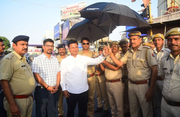 पत्रिका और नारायण सेवा संस्थान की ओर से भीषण गर्मी में चौराहे पर तैनात पुलिसकर्मियों को गर्मी से बचाव के लिए छाते, चश्मे और दस्ताने पहनाए देखें photo