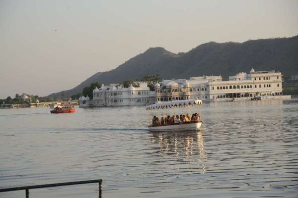 पिछोला झील में शाम को बोटिंग करते पर्यटक। तापमान में बढ़ोतरी के साथ ही इन दिनों तेज गर्मी पड़ रही है । ऐसे में पर्यटक स्थलों पर भी दिनभर सन्नाटा रहता है वही शाम होने के बाद ठंडी बयार के साथ पर्यटक बोटिंग का लुफ्त लेते