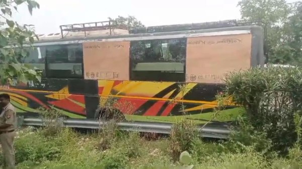 यह दुर्घटनाग्रस्त बस: जिसमें शीशे की जगह प्लाईवुड लगाया गया है। 18 लोगों की मौत के बाद प्रशासनिक अमला भी एक्सप्रेस में पहुंचा और मौके का निरीक्षण किया।