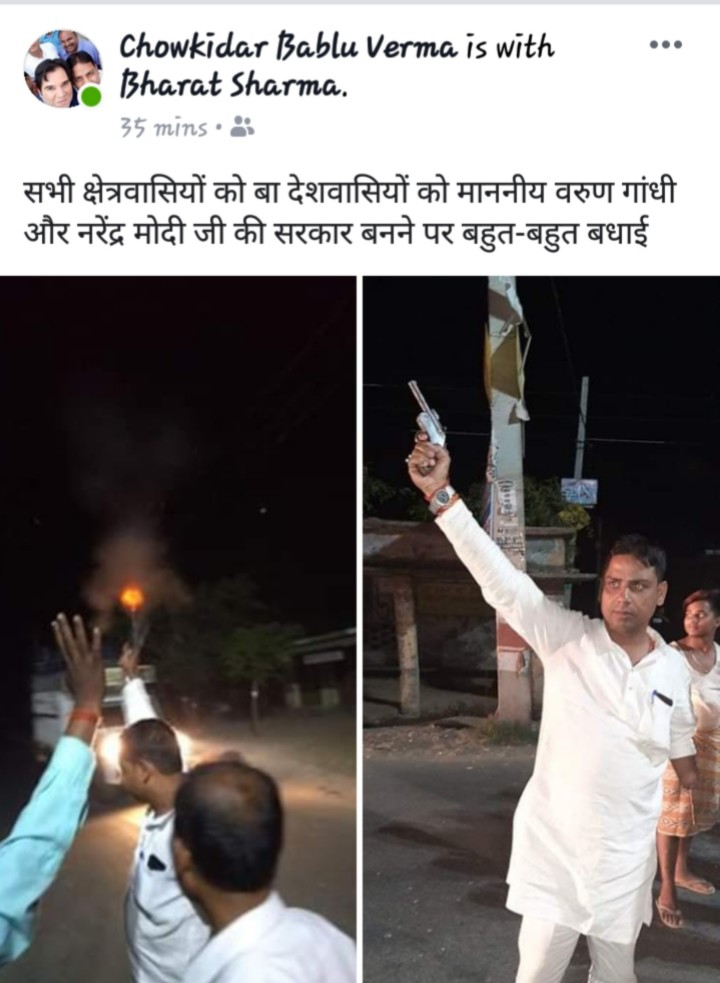 पीलीभीत लोकसभा सीट पर वरुण गांधी की जीत के बाद बबलू वर्मा नाम के भाजपा कार्यकर्ता ने फेसबुक पर पोस्ट डाली जिसमे वो तमंचा लहराते हुए दिखाई पड़ रहा है। फेसबुक पर तमंचा लहराते हुए फोटो अपलोड होने के कुछ देर बाद ही फोटो तेजी से वायरल हो गया जिससे खलबली मच गई। फोटो वायरल होने के बाद वाट्सअप के ग्रुप में भी पहुँचा। फोटो चौकीदार बबलू वर्मा नाम की फेसबुक आईडी पर पोस्ट किया गया है। पोस्ट में वरुण गांधी और नरेंद्र मोदी की सरकार बनने पर बधाई भी दी गई है।
