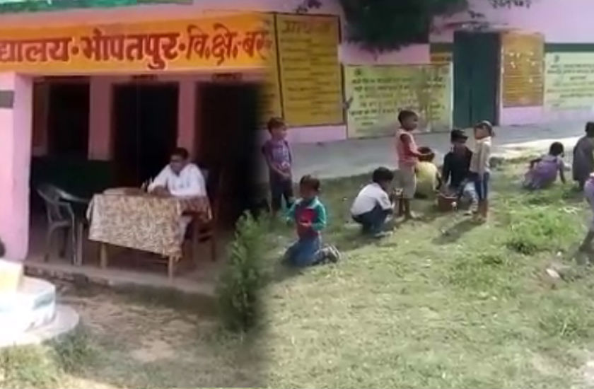 यह तस्वीरें हैं बरखेड़ा ब्लॉक के भोपतपुर गांव में प्राथमिक विद्यालय की, यहां के हेडमास्टर प्रभात मिश्रा आराम से कुर्सी डाले छांव में बैठे हैं। मास्टर साहब बच्चों को पढ़ाने के बजाए उनसे स्कूल में पहले तो झाड़ू लगवाते हैं और फिर स्कूल के मैदान में बड़ी घास छिलवाने के काम पर लगा देते हैं। ऐसा आज ही नहीं हो रहा है यह सिलसिला उनका रोजाना का है।