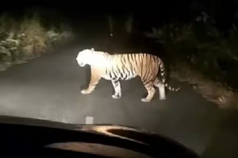 बीच सड़क चहलकदमी करता दिखा बाघ
