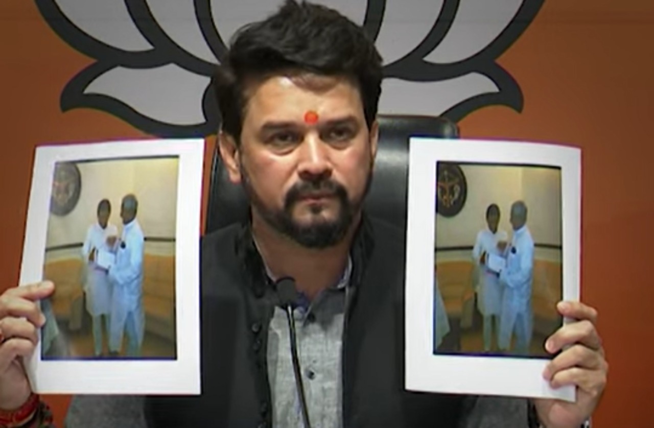 आतंकी सैफ के पिता की अखिलेश यादव के साथ तस्वीर दिखाते केंद्रीय मंत्री अनुराग ठाकुर।