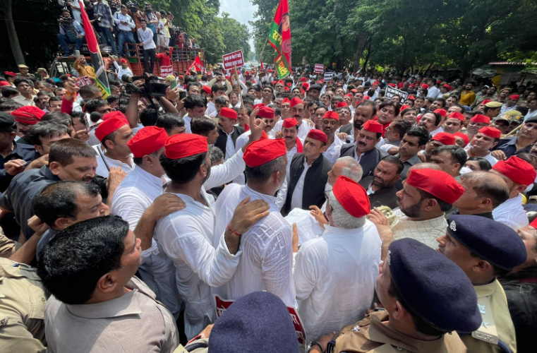 सपा विधायकों और कार्यकर्ताओं के साथ सड़क पर विरोध प्रदर्शन करते हुए अखिलेश यादव