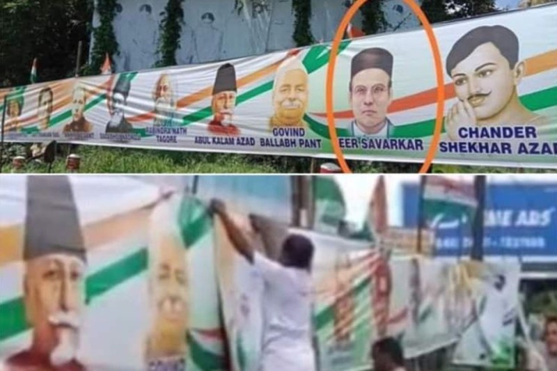 इन्ही स्वतंत्रता सेनानियों में एक तस्वीर वीर सावरकर की भी थी। जब इस बात की जानकारी कांग्रेस कार्यकर्ताओं को लगी तो उन्होंने आनन फानन में सावरकर की जगह गांधी जी की फोटो चस्पा कर दी। अब कांग्रेस की इसी हरकत को लेकर बीजेपी हमलावर है।