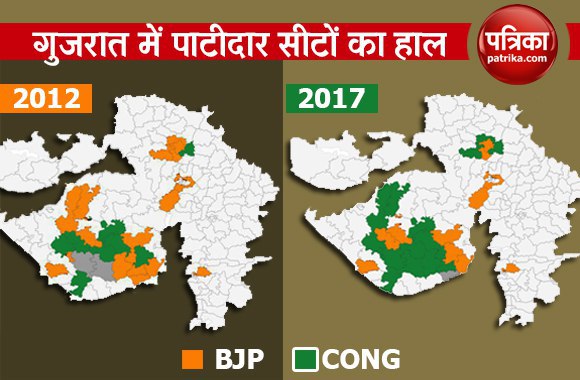 इस नक्शे के जरिए आप देख सकते हैं कि 2012 के चुनावी नतीजों के मुकाबले 2017 में अभी तक के रूझानों के मुताबिक, बीजेपी को पाटीदार सीटों पर नुकसान होता दिख रहा है। जहां एक तरफ 2012 के चुनाव में बीजेपी को पाटीदार प्रभावित इलाकों में 28 सीटें मिली थी तो वहीं कांग्रेस को 9 सीटें मिली थी, जबकि अन्य के खाते में 2 सीटें गई थी