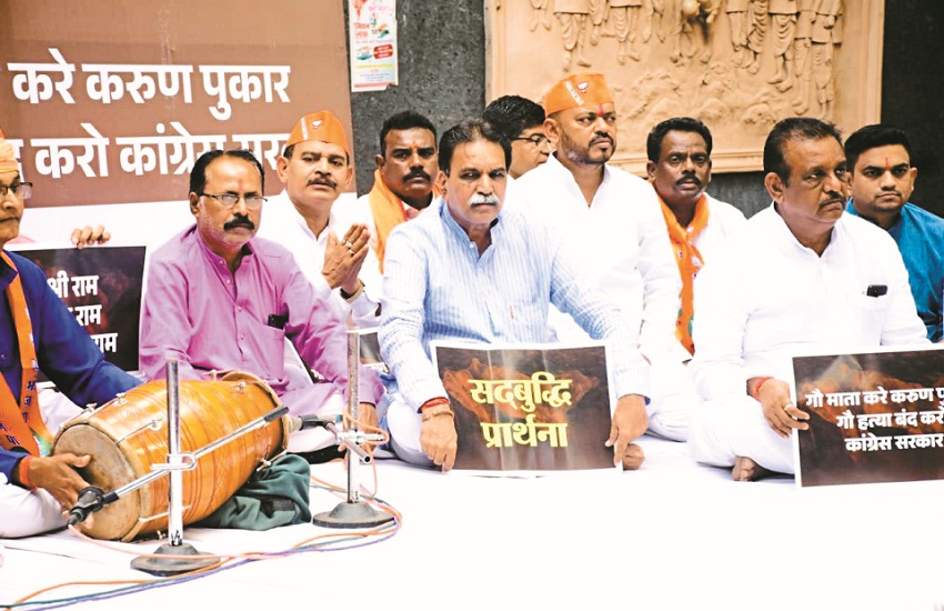 रायपुर। CG Politics : जरवाय गोठान में गायों की मौत मामले में भाजपा कार्यकर्ताओं ने पूर्व मंत्री राजेश मूणत के नेतृत्व में कांग्रेस की सद्बुधि के लिए प्रार्थना की। कार्यकर्ताओं ने आजाद चौक स्थित राष्ट्रपिता महात्मा गांधी प्रतिमा के सामने बैठकर भजन भी गाए।