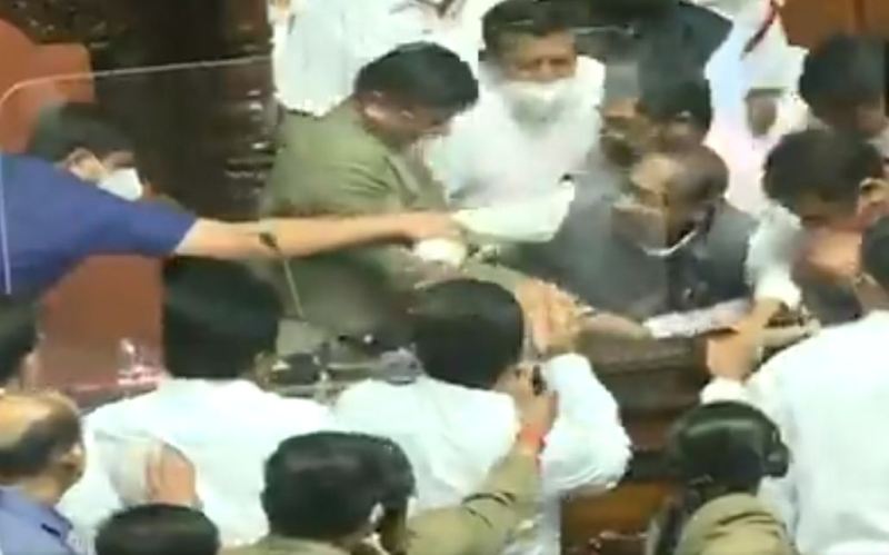कर्नाटक विधान परिषद के एक दिनी विशेष सत्र में जमकर हंगामा हुआ। सत्तापक्ष व विपक्ष एमएलसी के बीच जमकर धक्का-मुक्की हुई और नौबत हाथापाई की आ गई। इसी दौरान कांग्रेस के सदस्यों ने सभापति यानी चेयरमैन की कुर्सी पर बैठे डिप्टी चेयरमैन को बलपूर्वक उठा दिया।