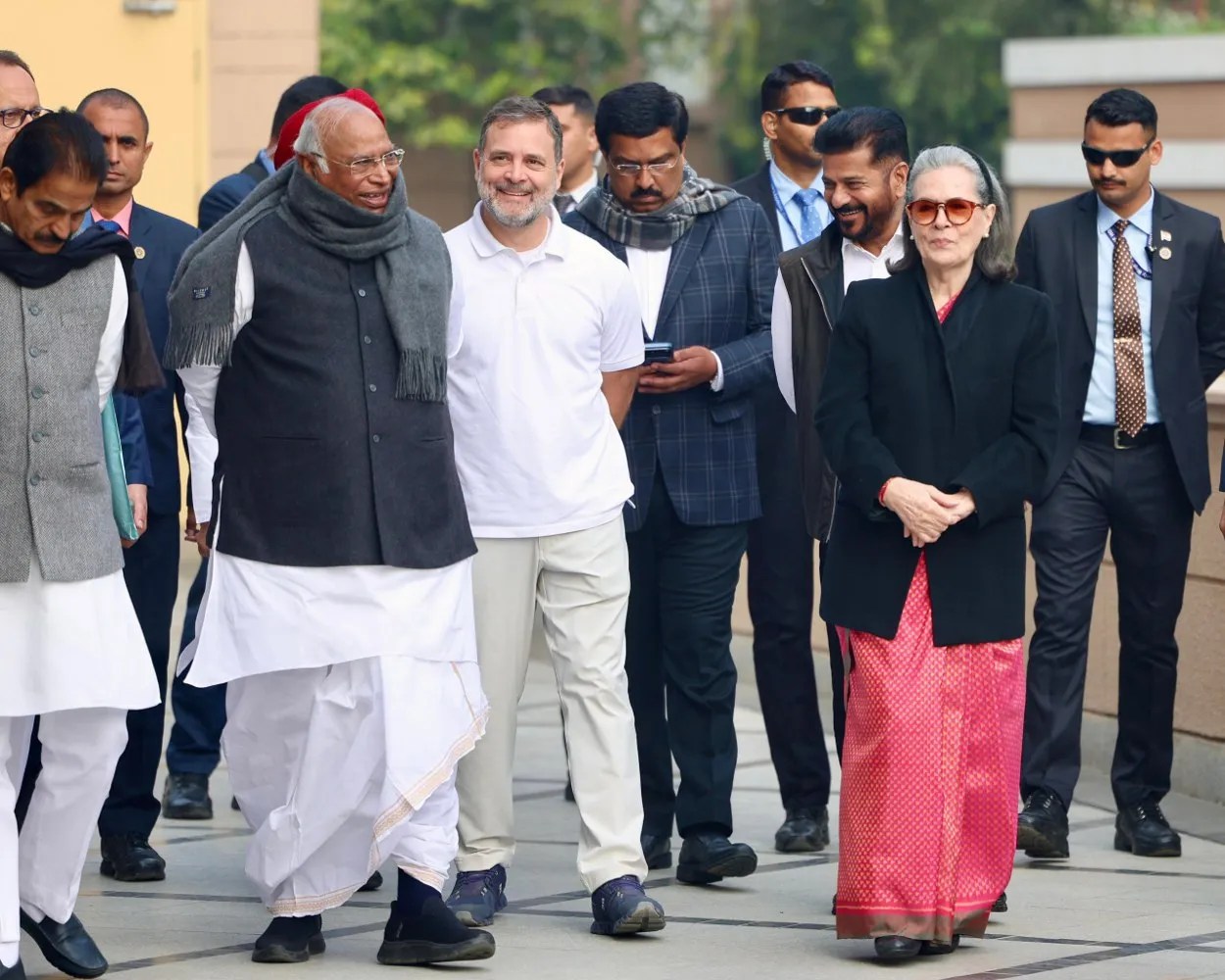 कांग्रेस कार्यसमिति की बैठक के लिए जाते मल्लिकार्जुन खरगे, राहुल गांधी, सोनिया गांधी व अन्य नेता।