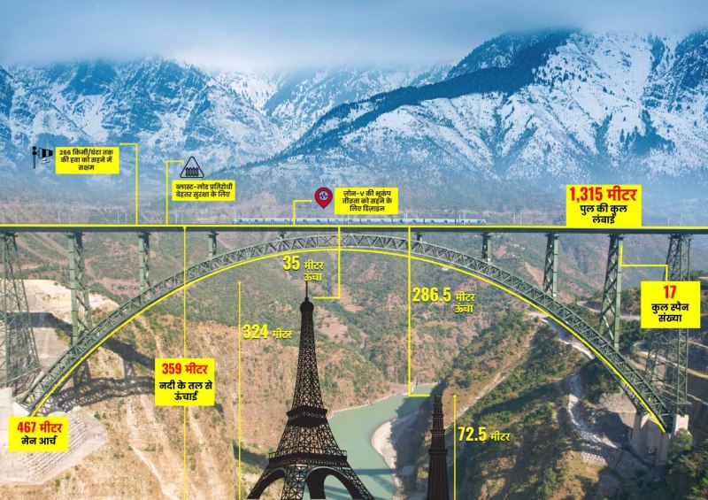 359 मीटर की ऊंचाई पर स्थित वास्तुकला का चमत्कार चिनाब रेल पुल दुनिया का सबसे ऊंचा रेलवे आर्च ब्रिज है। यह 1,315 मीटर लंबा स्टील आर्च ब्रिज है जिसे भूकंप और हवा की हर स्थिति का सामना करने के लिए तैयार किया गया है। इस पुल से जम्मू और श्रीनगर के बीच संपर्क बढ़ेगा। अंजी ब्रिज भारत का पहला केबल-स्टेड रेल ब्रिज है जो इस चुनौतीपूर्ण भूभाग में राष्ट्र की सेवा करेगा।