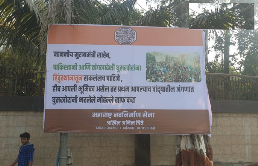 महाराष्ट्र नवनिर्माण सेना विद्यार्थी परिषद के उपाध्यक्ष अखिल अनिल चित्रे ( Akhil Anil Chitre ) द्वारा लगाए गए इस बैनर में उद्धव ठाकरे ( Uddhav Thackeray ) से निवेदन किया गया है कि अगर आप अवैध घुसपैठियों को भारत से बाहर निकालने को लेकर वाकई गंभीर हैं तो इसकी शुरुआत अपने क्षेत्र बांद्रा से कीजिए।