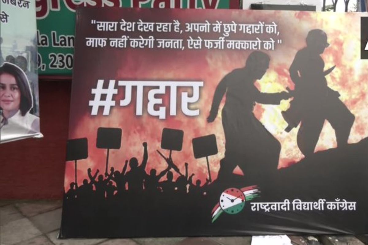 राष्ट्रवादी कांग्रेस पार्टी में बगावत के बाद अब दोनों खेमे अब एक दूसरे पर वार पलटवार कर रहे है। गुरुवार को दिल्ली में महाराष्ट्र के पूर्व मुख्यमंत्री और NCP में शरद गुट के अध्यक्ष शरद पवार के घर के बाहर उनके समर्थकों ने पोस्टर लगाए है। पोस्टर में अजित पवार को कटप्पा और गद्दार बताया गया है। इसके साथ ही उसमें शायराना अंदाज में वार करते हुए लिखा गया है कि जनता अजित को माफ नहीं करेगी।