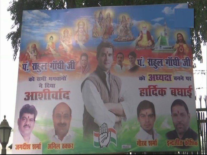 यहां लगे एक पोस्टर में राहुल गांधी को 'पंडित राहुल गांधी' बताया गया है। इसके अलावा अध्यक्ष बनने से पहले से ही अध्यक्ष बताते हुए बधाई दी है। इस पोस्टर में सभी धर्म की तस्वीर भी लगाई गई है। जिससे निकलता हुआ तेज राहुल गांधी की ओर आ रहा है। पोस्टर में लिखा गया है कि पंडित राहुल गांधी जी को सभी धर्मों से आशीर्वाद मिला।