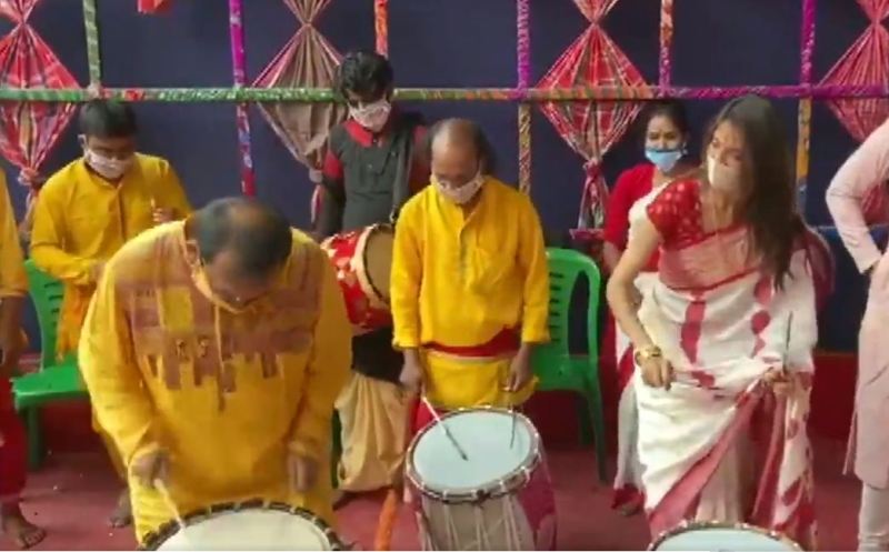 ढाक बजाते हुए टीएमसी सांसद नुसरत जहां
