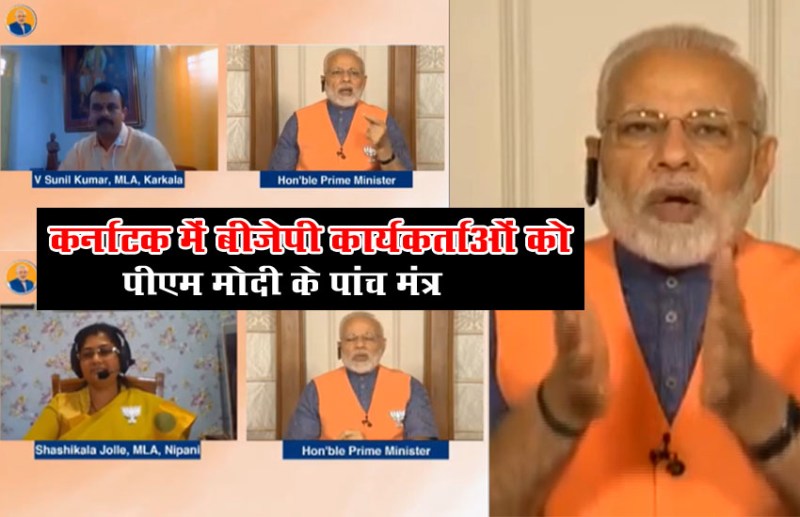 नई दिल्ली। प्रधानमंत्री नरेंद्र मोदी ने आज कर्नाटक के बीजेपी नेताओं को नमो एप के जरिए संबोधित किया। इस दौरान उन्होंने मिशन कर्नाटक के लिए कार्यकर्ताओं में जमकर जोश भरा। पीएम मोदी ने कहा बीजेपी वर्कर को जीत के 5 मंत्र दिए। इस दौरान पीएम मोदी ने कांग्रेस पर जमकर भड़ास निकाली साथ ही भाजपा के विकास के एजेंडे के बारे में कार्यकर्ताओं से खुलकर चर्चा की। आईए जानते हैं पीए मोदी ने कर्नाटक में भाजपा कार्यकर्ताओं को जीत के कौन से 5 मंत्र दिए..