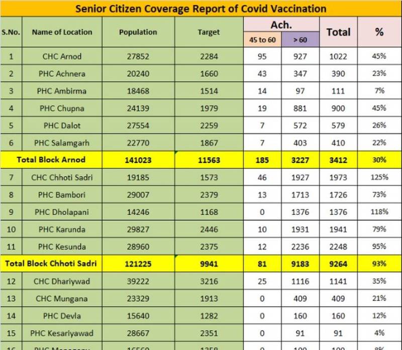 वरिष्ठ नागरिकों को महामारी से सुरक्षा को लेकर स्वास्थ्य विभाग द्वारा दिए गए लक्ष्य की प्राप्ति के लिए उपखंड अधिकारी के निर्देशन में कर्मचारियों ने निर्देशों की पालना करते हुए वरिष्ठ नागरिकों की सूची तैयार कर और लोगों को वैक्सीन के प्रति जागरूक करने से दिए गए लक्ष्य को पूर्ण करने में सफलता हासिल हुई है। वहीं चिकित्सालय प्रभारी के निर्देशन में स्वास्थ्य कर्मियों द्वारा बेहतर व्यवहार का परिचय देते हुए अपना कार्य पूर्ण करने से यह लक्ष्य प्राप्त हुआ है।