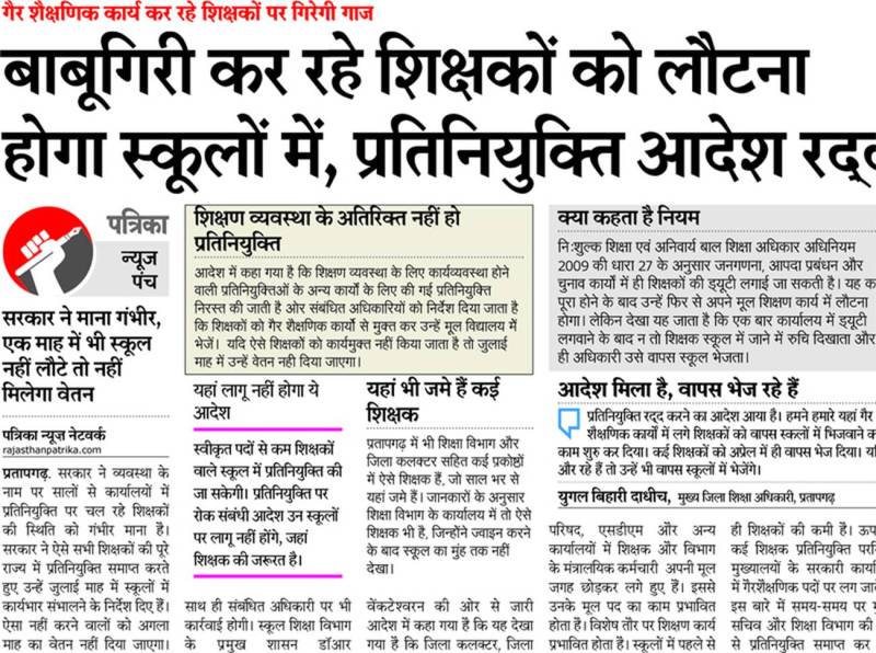 आदेश में कहा गया था कि शिक्षण व्यवस्था के लिए कार्यव्यवस्था होने वाली प्रतिनियुक्तिओं के अन्य कार्यों के लिए की गई प्रतिनियुक्ति निरस्त की जाती है ओर संबंधित अधिकारियों को निर्देश दिया जाता है कि शिक्षकों को गैर शैक्षणिक कार्र्याे से मुक्त कर उन्हें मूल विद्यालय मेें भेजें। यदि ऐसे शिक्षकों को कार्यमुक्त नहीं किया जाता है तो जुलाई माह में उन्हें वेतन नही दिया जाएगा।
