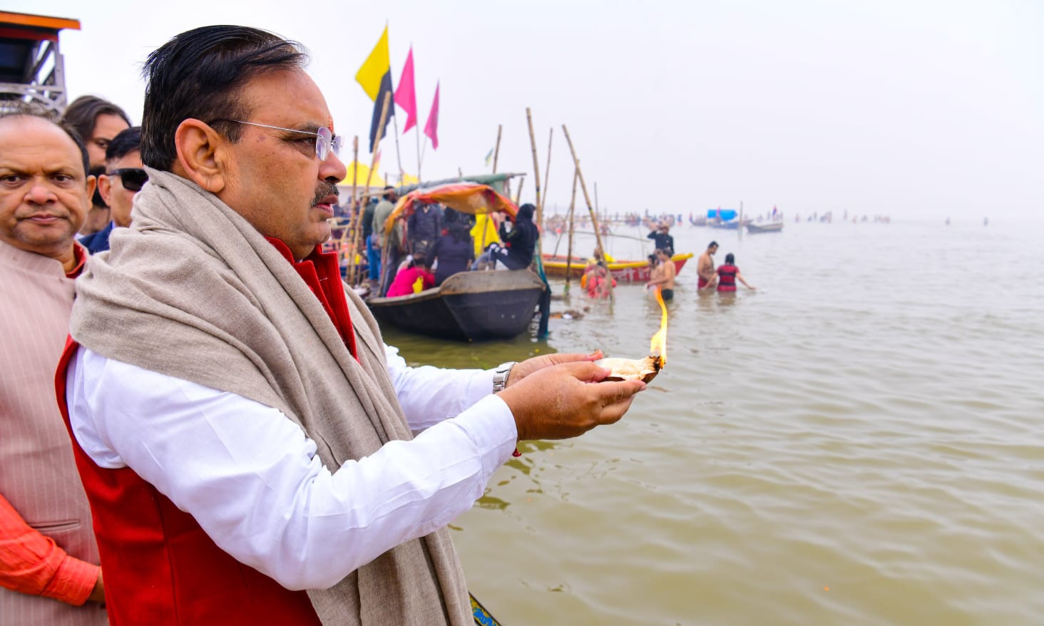 Bhajanlal Sharma in Mahakumbh Mela: राजस्थान के मुख्यमंत्री भजनलाल शर्मा ने रविवार सुबह महाकुम्भ में त्रिवेणी संगम में स्नान कर पूजा अर्चना की। मुख्यमंत्री भजनलाल शर्मा शनिवार देर रात महाकुम्भ मेला क्षेत्र में सेक्टर 7 स्थित राजस्थान पवेलियन पहुंचे। सुबह बोट से त्रिवेणी संगम का अवलोकन किया। उन्होंने त्रिवेणी संगम घाट पर पावन डुबकी लगाने के बाद मां गंगे की पूजा अर्चना, भगवान महादेव का दूध एवं गंगा जल से अभिषेक भी किया। मुख्यमंत्री ने मां गंगे की आरती की और बड़े हनुमान जी के दर्शन भी किए। उन्होंने महाकुम्भ के महाआयोजन को लेकर उत्तर प्रदेश के मुख्यमंत्री योगी आदित्यनाथ की मुक्त कंठ से प्रशंसा की और उन्हें इस आयोजन के कुशल संचालन के लिए बधाई दी।