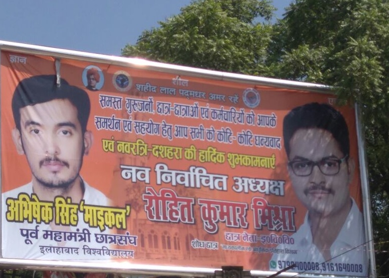 इलाहाबाद. पूरब के आक्सफोर्ड में तीन दशक बाद छात्र संघ की सत्ता का अध्यक्ष पद अखिल भारतीय विद्यार्थी परिषद् के झोली में आया कार्यकर्ता से लेकर पदाधिकारी तक इस जीत की खुसी से गदगद है परिषद् ही नहीं संघ के सभी विचार और अनुशागिंक संगठन भी सडको से लेकर सोशल साईट तक पर गुडगान करते नही थक रहे अशोक सिघल का नाम लेकर निर्वाचित अध्यक्ष ने उन्हें श्रधान्जली दी तो वही जीत की ख़ुशी दोगुनी हो गई जब भाजपा के राष्ट्रीय अध्यक्ष अमित शाह ने यह कहते हुए बधाई दी की प्रदेश में बदलाव शुरू हो गया है अध्यक्ष और संगठन को बधाई लेकिन यह ख़ुशी थोड़ी देर में इविवि के शिक्षक समेत छात्रो और छात्र राजनीती में दिल चस्पी रखने वाले शहरियों को अखरने लगी