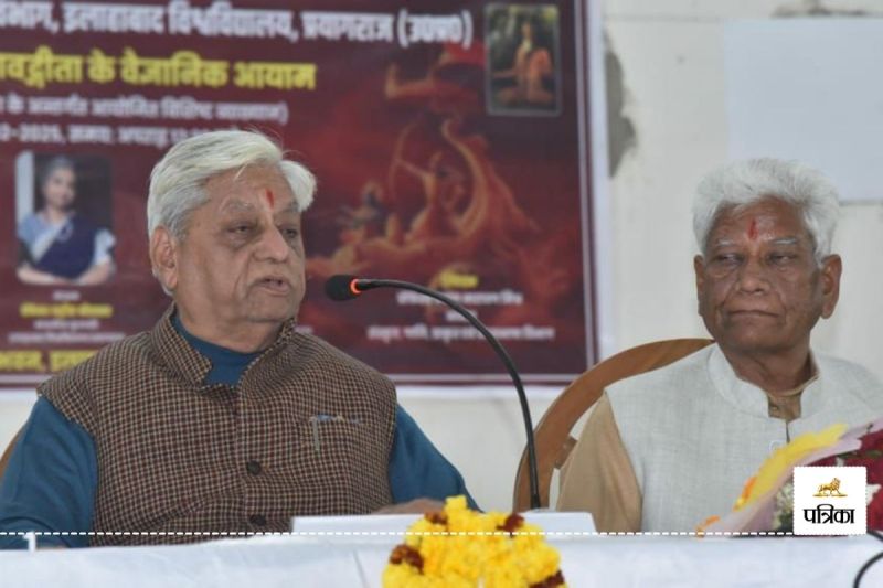 ‘भगवद्गीता के वैज्ञानिक आयाम’ विषय पर मुख्य वक्ता डॉ गुलाब कोठारी ने अपने व्याख्यान में कहा कि गीता को सर्वदा इस भाव से पढ़ना चाहिए कि मानो भगवान श्रीकृष्ण हमसे कह रहे हैं। इस प्रकार हमें अर्जुन बनना पड़ेगा। गीता में भगवान केवल दो विषयों की पप्रधानता से चर्चा करते हैं -धर्म और कर्म। इसमें जो आत्मविषयक चिन्तन है वह धर्म है और जो विषाद की चर्चा है वह कर्म विचार है। गीता सृष्टि का विज्ञान है जो सभी प्राणियों पर एक नियम लागू करती है। धर्म ही ज्ञान है और कर्म ही विज्ञान है। विविधं ज्ञानं विज्ञानम् यह विज्ञान की परिभाषा है। मम योनिर्महद्ब्रह्म तस्मिन्गर्भं दधाम्यहम्। सम्भव: सर्वभूतानां ततो भवति भारत। इस मंत्र में पूरी सृष्टि प्रक्रिया वर्णित है। इस पर शोधार्थी विद्वानों को गूढ़ रहस्य परक विचार करना चाहिए।