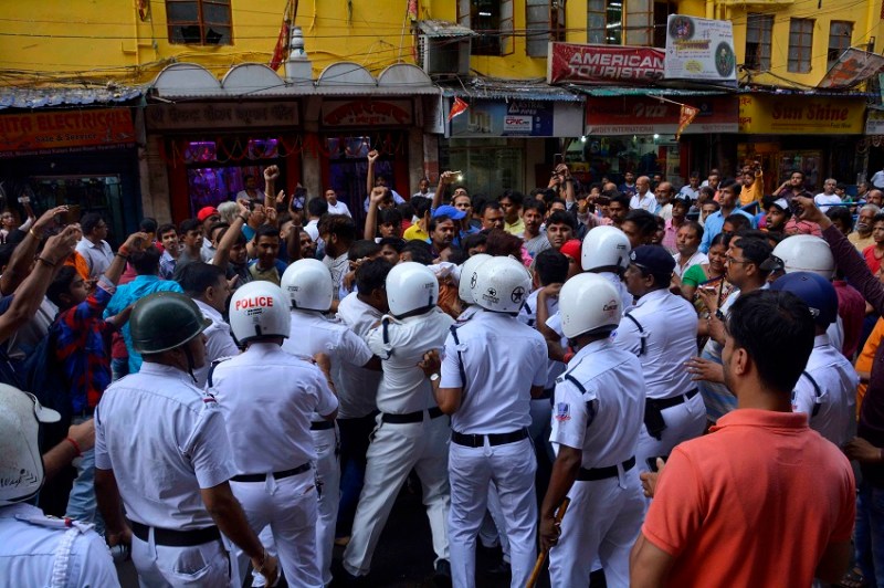 north Howrah AC market on dobson road उत्तर हावड़ा के एसी मार्केट के समीप डबसन रोड स्थित sree sankatmocha hanuman temple near group hanuman chalisha श्री संकट मोचन हनुमान मंदिर के समक्ष मंगलवार की दोपहर 3:30 बजे आयोजित सामूहिक हनुमान चालीसा पाठ के दौरान पुलिस और भाजपा समर्थक भिड़ गए। दोनों पक्षों में तीखी नोक झोंक हुई। पाठ करने वालों को सडक़ से हटाने के लिए पहुंची पुलिस और भाजपा समर्थकों के बीच हाथापाई की नौबत आ गई। बाद में मामला शांत हो गया। पुलिस बैरीकेड के बीच हनुमान चालीसा पूरी की गई।