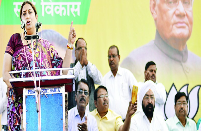 रायगढ़/साल्हेओना. रायगढ़ विधानसभा क्षेत्र के सरिया में सोमवार को भाजपा की स्टार प्रचारक व केन्द्रीय कपड़ा मंत्री स्मृति ईरानी भाजपा के पक्ष चुनाव प्रचार करने पहुंची। इस दौरान उन्होंने जहां २० नवंबर को कमल छाप में वोट डालने की अपील की तो वहीं कांग्रेस के पास मुख्यमंत्री का चेहरा न होने का आरोप लगाते हुए कांग्रेस अध्यक्ष राहुल गांधी पर जमकर निशाना साधा।
