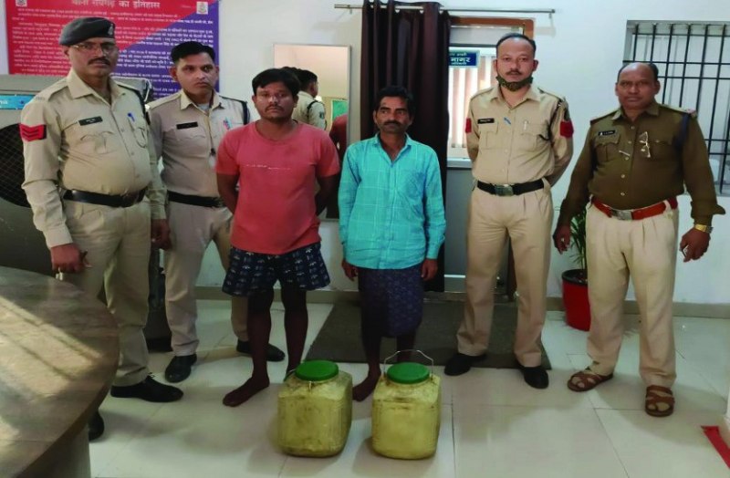 इस संबंध में पुलिस से मिली जानकारी के अनुसार शुक्रवार की सुबह मुखबिर से थाना प्रभारी कोतवाली निरीक्षक मनीष नागर को सूचना मिला कि कुछ लोगों के द्वारा लाखा काजूबाड़ी जंगल में अवैध रूप से महुआ शराब बनाकर बिक्री किया जा रहा है। सूचना पर थाना प्रभारी द्वारा हमराह स्टाफ घेराबंदी कर काजूबाड़ी जंगल में छापामार कार्रवाई की। इस दौरान एक स्थान पर आरोपी कमल सिंह बघेल पिता कन्हैया सिंह बघेल उम्र 30 वर्ष निवासी गेरवानी थाना पूंजीपथरा स्थाई पता ग्राम गोर्रा थाना कोतरारोड़ से 15 एवं 5 लीटर की जरकिन में 20 लीटर महुआ शराब जब्त किया गया, जिसकी कीमत करीब चार हजार रुपए आंकी गई है। वहीं आरोपी मदन सिंह बर्मन पिता बहार सिंह बर्मन उम्र 42 वर्ष निवासी गेरवानी थाना पूंजीपथरा से 15 लीटर की जरकिन में 15 लीटर महुआ शराब की जब्त की गई। दोनों आरोपियों से कुल 35 लीटर महुआ शराब जब्त की गई। वहीं आरोपियों पर थाना कोतवाली में धारा 34(2), 59(क) आबकारी एक्ट के तहत कार्रवाई करते हुए उन्हें रिमांड पर भेजा गया है। कार्रवाई में थाना प्रभारी मनीष नागर के साथ एएसआई के.के. गुप्ता, प्रधान आरक्षक श्रीराम साहू, प्रधान आरक्षक दिग्विजय दास वैष्णव, आरक्षक रूपलाल पटेल का सराहनीय योगदान रहा है।