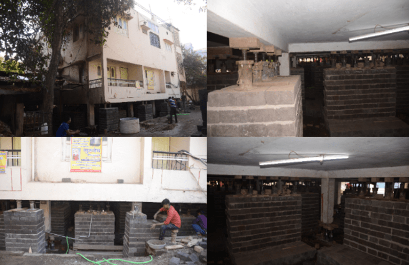 - सबसे पहले मकान को खाली कराकर अंदर के फर्श को खोदा और नींव को साइड से उखाड़कर दासे की पटिया के नीचे लोहे के एंगल फंसाए।
