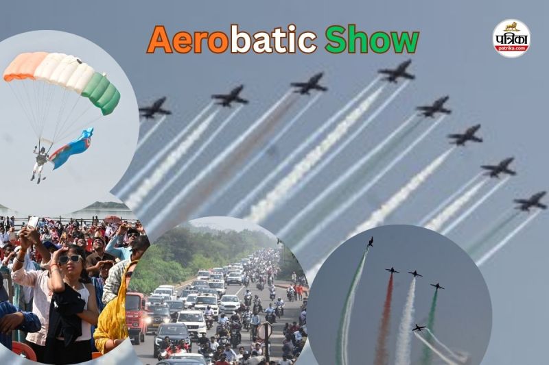 Aerobatic Show: छत्तीसगढ़ के रायपुर राज्योत्सव के अंतिम दिन नवा रायपुर के सेंध जलाशय परिसर में एयर शो का आयोजन किया गया। रायपुर समेत आसपास के जिलों के हजारों लोग वायुसेना के शौर्य को देखने पहुंचे। आकाश गंगा की डाइविंग टीम ने पैराशूट से छलांग लगाकर ऑपरेशनल डिस्प्ले किया। थोड़ी देर में आसमान सूर्यकिरण के लड़ाकू विमानों से गडग़ड़ाने लगा।