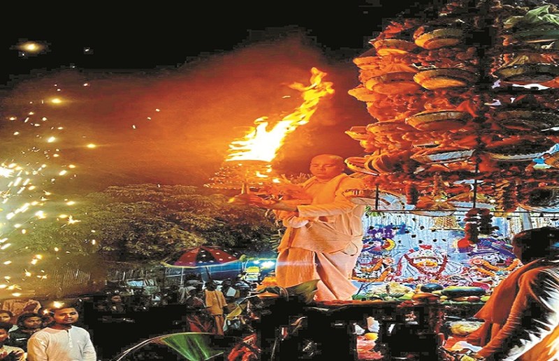 इधर, 40 फीट की ऊंचाई से भगवान को चढ़ा 108 भोग