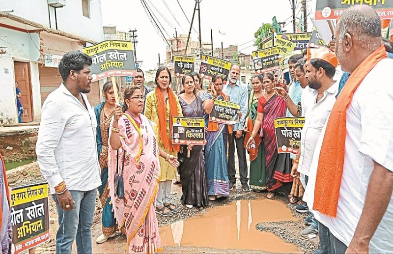 Chhattisgarh News: रायपुर। सड़कों की खुदाई, आधा-अधूरा निर्माण से शहर बदहाल है। भाजपा पार्षद दल ने निगम में नेता प्रतिपक्ष मीनल चौबे के नेतृत्व में पोल खोल अभियान के तीसरे दिन दुबे कॉलोनी मोवा, होम प्राइड, कूल होम, दलदल सिवनी पहुंचा। हिचकोले खाती (Raipur News) गाड़ियां के बीच महापौर एजाज ढेबर की कार्यशैली के खिलाफ जमकर नारेबाजी करते हुए गड्ढों में पोल खोल के बैनर गाड़े।