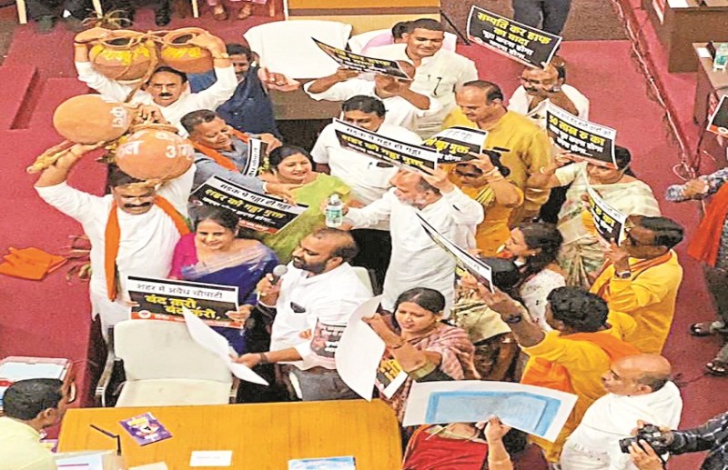 भाजपा पार्षदों ने मटका फोड़कर किया हंगामा
