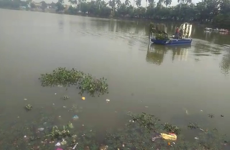 बूढ़ा तालाब को संवारने की कवायद शुरू, पानी से जलकुंभियों को निकालने उतारी गई मशीन