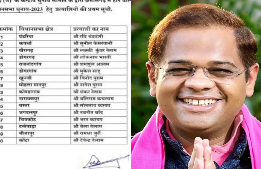 विधानसभा पंडरिया से रवि चंद्रवंशी, कवर्धा से सुनील केसरवानी, खैरागढ़ से लक्की कुंवर नेताम, डोंगरगढ़ से लोकनाथ भारती, डोंगरगांव से मुकेश साहू, खुज्जी से विनोद पुराम, मोहला-मानपुर से नागेश पुराम, नारायणपुर से बलीराम कचलाम, बस्तर से सोनसाय कश्यप, चित्रकोट से भरत कश्यप, दंतेवाड़ा से बेला तेलाम, बीजापुर से रामधर जुर्री और विधानसभा कोंटा से देवेंद्र तेलाम को प्रत्याशी बनाया गया है।