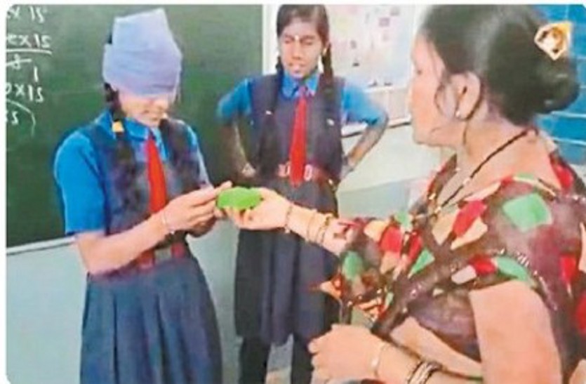 आँखों पर पट्टी बांधकर पत्तियाँ पहचानती छात्राएं