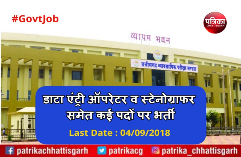 रायपुर. छत्तीसगढ़ व्यावसायिक परीक्षा मंडल ने असिस्टेंट, डाटा एंट्री ऑपरेटर, कंप्यूटर ऑपरेटर, स्टेनोग्राफर एवं स्टेनो टाइपिस्ट पदों के लिए भर्ती निकाली है। शिक्षित व योग्य अभ्यर्थियों के पास सरकारी नौकरी पाने का सुनहरा मौका है। यह भर्ती 169 पदों पर होनी है। इस भर्ती के लिए छत्तीसगढ़ व्यावसायिक परीक्षा मंडल ने नोटिफिकेशन जारी किया है। अगर आप भी आवेदन करना चाहते हैं तो इन पदों के लिए आवेदन की पूरी प्रक्रिया के लिए नीचे दी गई जानकारी अवश्य पढ़ें।