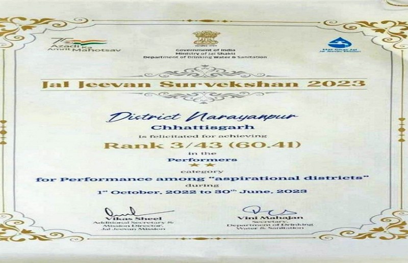 नारायणपुर जिले को आकांक्षी जिले के अंतर्गत जलजीवन सर्वेक्षण 2023 में उत्कृष्ट कार्य के लिए प्रशस्ति पत्र से केंद्रीय जलशक्ति, पेयजल एवं स्वच्छता विभाग ने सम्मानित किया है। मुख्यमंत्री भूपेश बघेल ने इस सम्मान के लिए नारायणपुर जिलावासियों को तथा इस कार्य में लगे जलजीवन मिशन के अधिकारियों एवं कर्मचारियों को बधाई दी है।