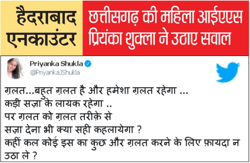 वहीं, छत्तीसगढ़ की महिला आईएएस अफसर प्रियंका शुक्ला ने हैदराबाद पुलिस द्वारा किए गए मुठभेड़ पर सवाल उठाए खड़े कर दिए हैं। उन्होंने गैंगरेप के आरोपियों को पुलिस द्वारा एनकाउंटर में मारना गलत बताया है।