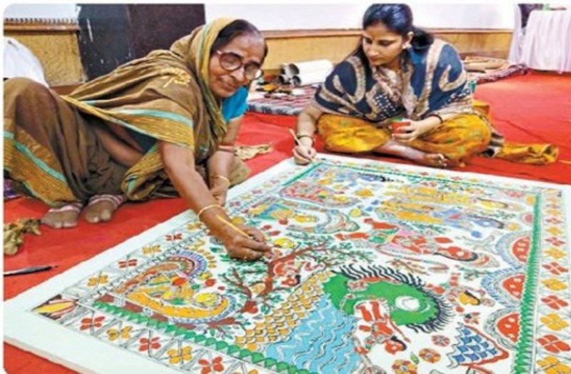 62 वर्षीय शांतिदेवी झा अपनी बेटी कुमकुम के साथ राम कथा पर पेंटिंग बनाती हुई