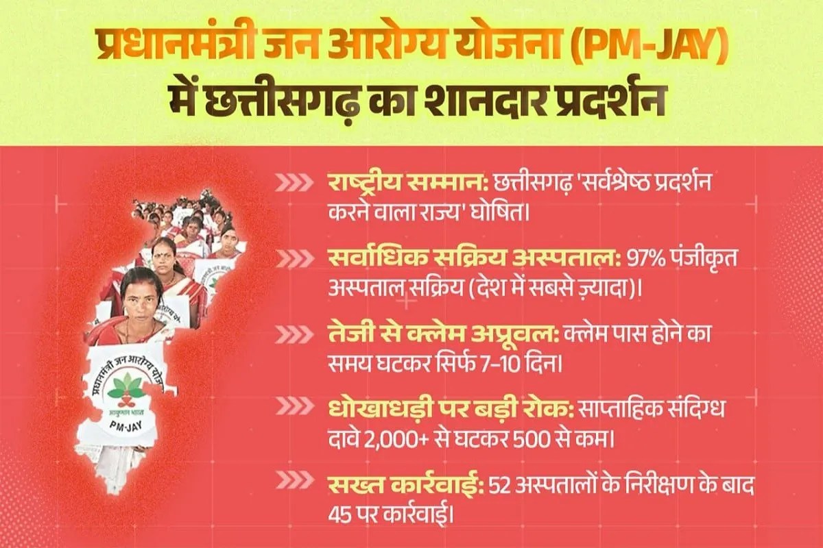 Ayushman Bharat Scheme: आयुष्मान भारत योजना (प्रधानमंत्री जन आरोग्य योजना) के संचालन में बेहतर प्रदर्शन के लिए छत्तीसगढ़ को नेशनल अवार्ड मिला है। योजना में प्रदेश ने सर्वश्रेष्ठ प्रदर्शन किया है। यहां 97 फीसदी अस्पतालों में योजना के तहत कैशलेस इलाज किया जा रहा है। अधिकारियों का दावा है कि देश में यह सबसे अधिक है। पड़ोसी राज्य मध्यप्रदेश में 62 व देश का औसत मात्र 52 फीसदी है।