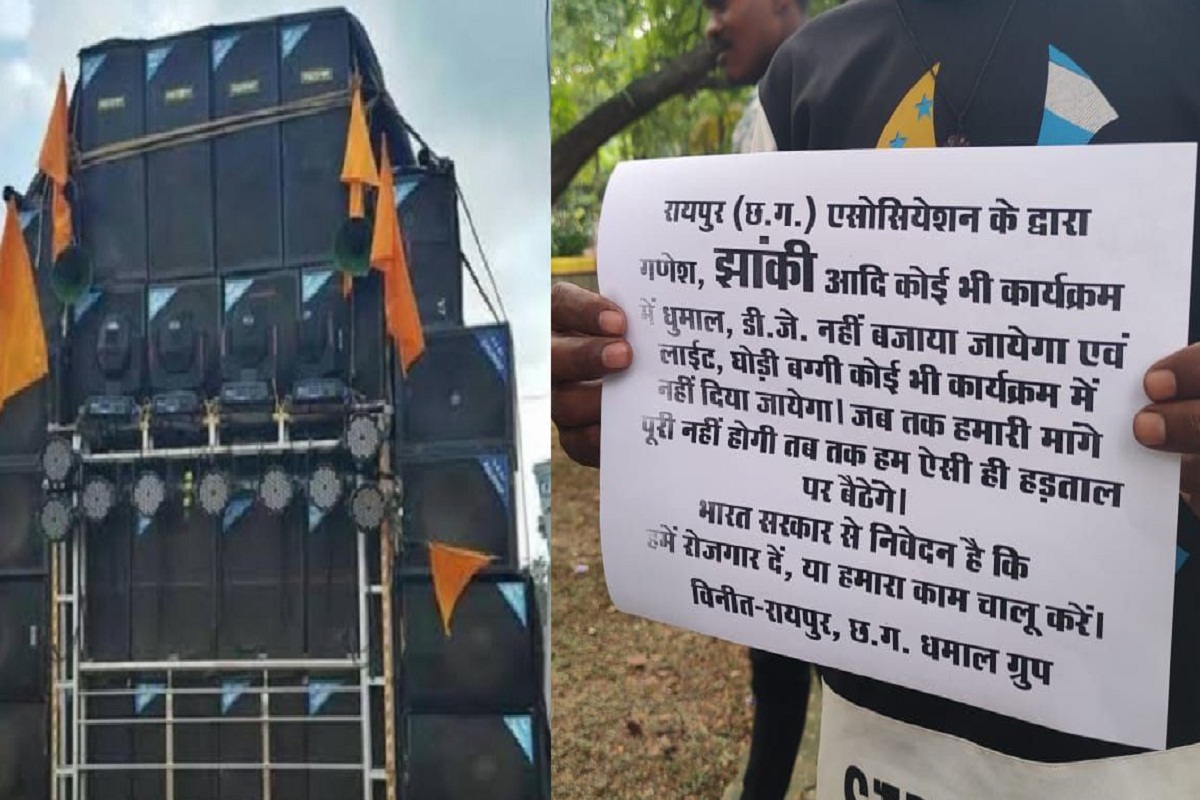 DJ Ban in CG: शादी, गणेश झांकी समेत अन्य कार्यक्रम में अब डीजे व धुमाल नहीं बजाने को लेकर संचालकों ने मोर्चा खोल दिया है। बता दें कि प्रदेशभर के धुमाल व डीजे ( DJ Ban in CG ) संचालक सरकार के फैसले से नाराज होकर लगातार प्रदर्शन कर रहे हैं। वहीं अब गणेश विसर्जन एवं झांकी में डीजे-धुमाल नही बजाने का लेकर कलेक्टर गार्डन में प्रदर्शन किया।