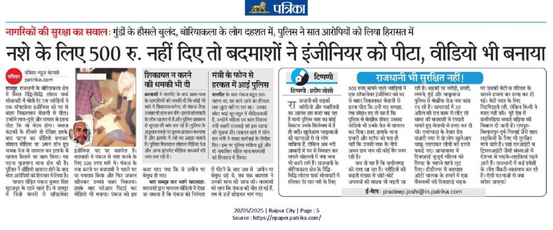 राजधानी के बोरियाकला क्षेत्र में स्थित रिद्धि-सिद्धि लोटस पार्क सोसायटी में बीती देर रात नशेडय़िों ने एक सॉफ्टवेयर इंजीनियर को घर से बाहर निकालकर बेरहमी से पीटा। उन्होंने लात-घूंसे और चप्पल से इतना पीटा कि वो बेदम होगा। समाज कंटकों के हौसले तो देखिए इसके बाद घटना का वीडियो बनाकर सोशल मीडिया पर अमन डॉन ग्रुप नामक पेज से वायरल कर इलाके में दहशत फैलाने का काम किया। यह घटना मुजगहन थाना क्षेत्र की है। पुलिस ने वीडियो वायरल होने के बाद सात आरोपियों को हिरासत में लिया है।