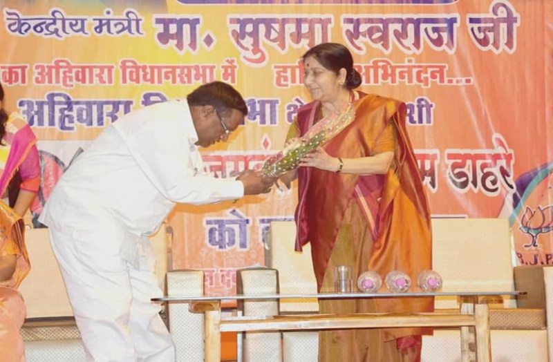 सुषमा स्वराज अहिवारा दुर्ग से भाजपा प्रत्याशी सांवलाराम डाहरे के लिए चुनाव प्रचार में 10 नवंबर 2018 को अहिवारा पहुंची थी। स्वास्थ्य ठीक नहीं होने के कारण सुषमा ने कुर्सी पर बैठकर ही भाषण दिया था। sushma swaraj ने रमन सिंह (Raman Singh) के कार्यकाल में हुए कामों की तारीफ की थी उनके पीडीएस सिस्टम की चर्चा संयुक्त राष्ट्र संघ तक पहुंच चुकी है। सुप्रीम कोर्ट (Supreme Court) भी इस सिस्टम की तारीफ कर चुका है।