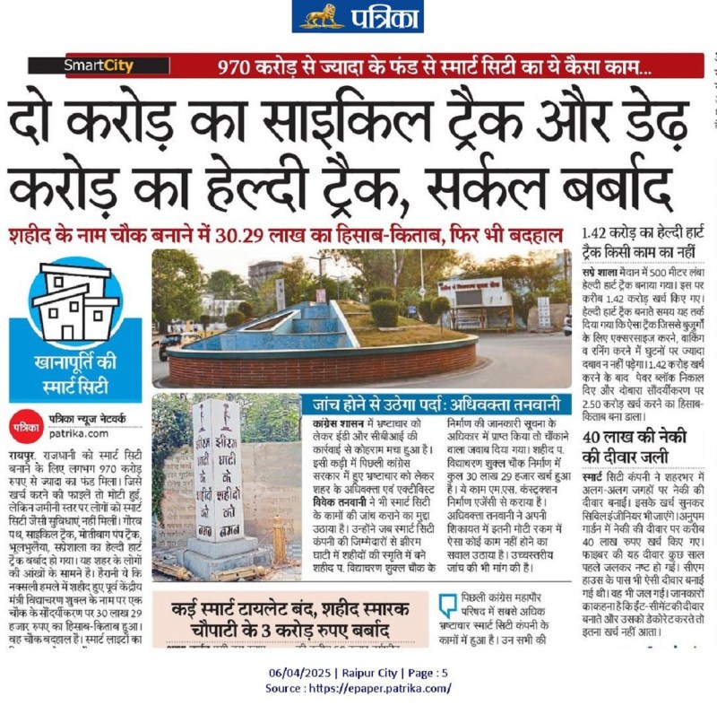 शहर के गौरव पथ, साइकिल ट्रैक, मोतीबाग पंप ट्रैक, भूलभुलैया, सप्रेशाला का हेल्दी हार्ट ट्रैक बर्बाद हो गया। यह शहर के लोगों की आंखों के सामने है। हैरानी ये कि नक्सली हमले में शहीद हुए पूर्व केंद्रीय मंत्री विद्याचरण शुक्ल के नाम पर एक चौक के सौंदर्यीकरण पर 30 लाख 29 हजार रुपए का हिसाब-किताब हुआ। वह चौक बदहाल है। स्मार्ट लाइटों का डिब्बा गुल हो चुका है।