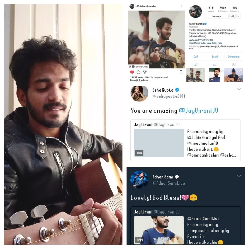 मैं हार्डी सांधू का बहुत बड़ा फैंन हूं और ज्यादातर उन्हीं के गानों की प्रैक्टिस करता हूं। रिकॉर्डिंग अपने पेज हैसटैग फॉलो योर ड्रीम पर शेयर करता हूं। अभी हाल ही में हार्डी ने मेरे पेज से उस गाने को अपने इंस्टा और फेसबुक पेज पर शेयर किया था। इसके अलावा ईशा गुप्ता ने बादशाहों के मेरे गाए हुए गाने सोचा है ये कि तुम्हें अपना भुलाएं को अपने पेज पर शेयर कर कमेंट किया था ‘यू आर अमेजिंग’, अदनान सामी के भीगी-भीगी रातों में मेरे गाए हुए गाने के वीडियो पर कॉमेंट किया ‘लवली गॉड ब्लेस यू’ ऐश किंग ने ये मौसम की बारिश गाने को अपने ट्वीटर पर शेयर किया था।